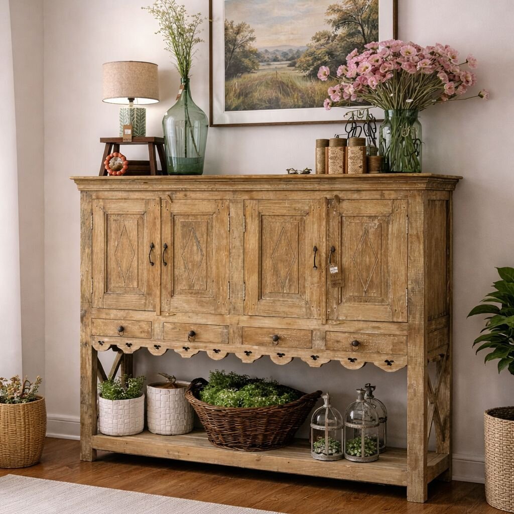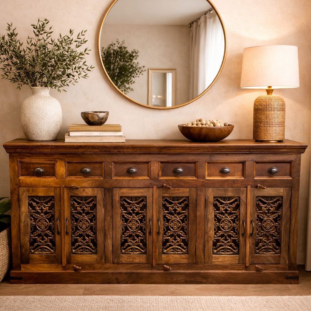 Iron Panel Inlay Wood Buffet w/ 6 Drawers