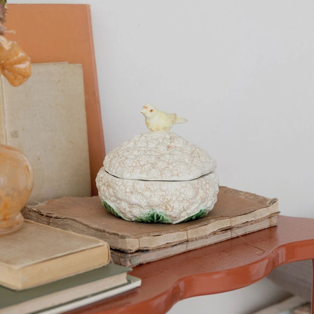 Unique Stoneware Cauliflower Shaped Container w/ Bird