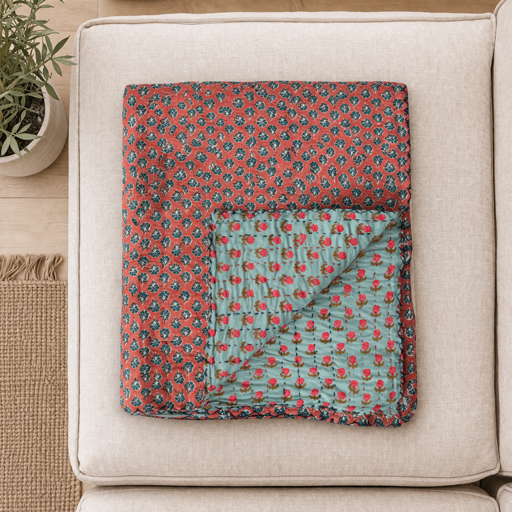Hand Embroidered Vintage Printed Rali Quilted Kantha Throw- (60"x50")