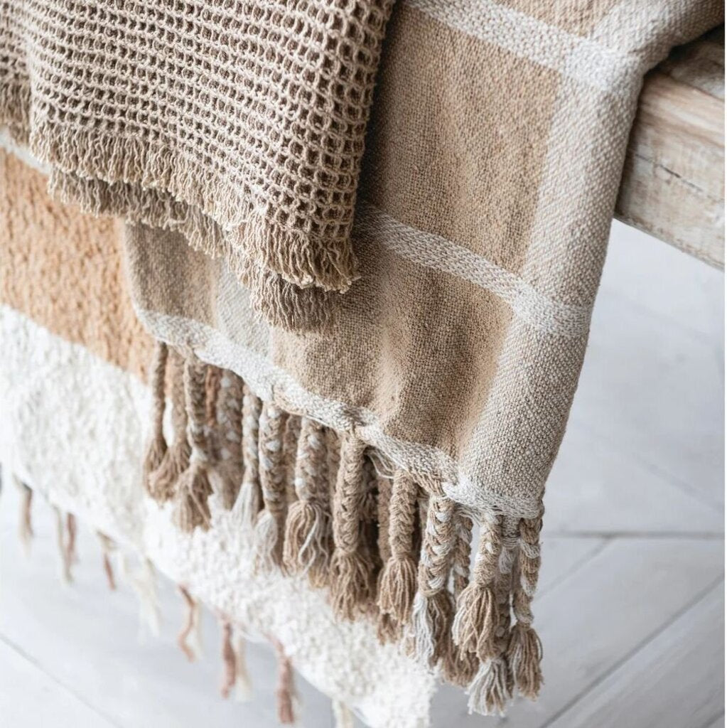 Beige Striped Throw + Braided Fringe