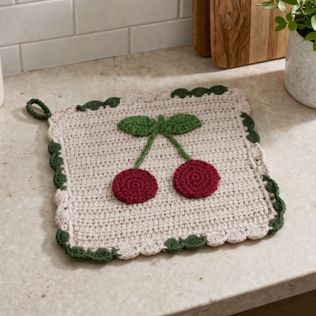 Crocheted Scalloped Pot Holder w/ Cherries