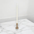 This Antique Brass Finish Taper Holder can hold a 1/2" wide taper candle. This holder would make a great addition to any shelf or tablescape.