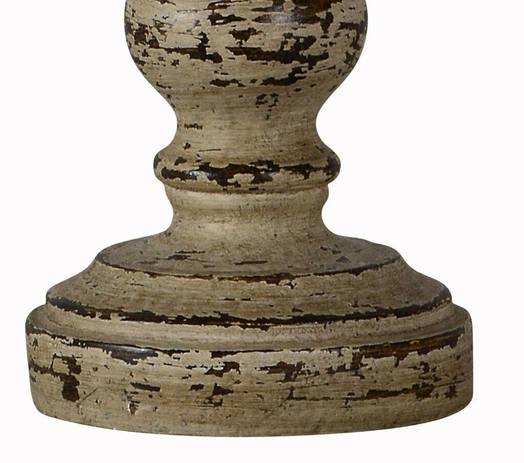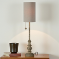The Jude Buffet Lamp blends vintage charm with rustic appeal. Crafted from polyresin, its turned base features a beautifully distressed tan and brown finish, mimicking the aged character of an antique find. The slender silhouette is topped with a tall, natural linen cylinder shade, adding a soft, diffused glow. A classic pull chain adds a functional touch, enhancing its timeless appeal.
