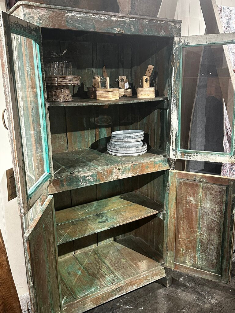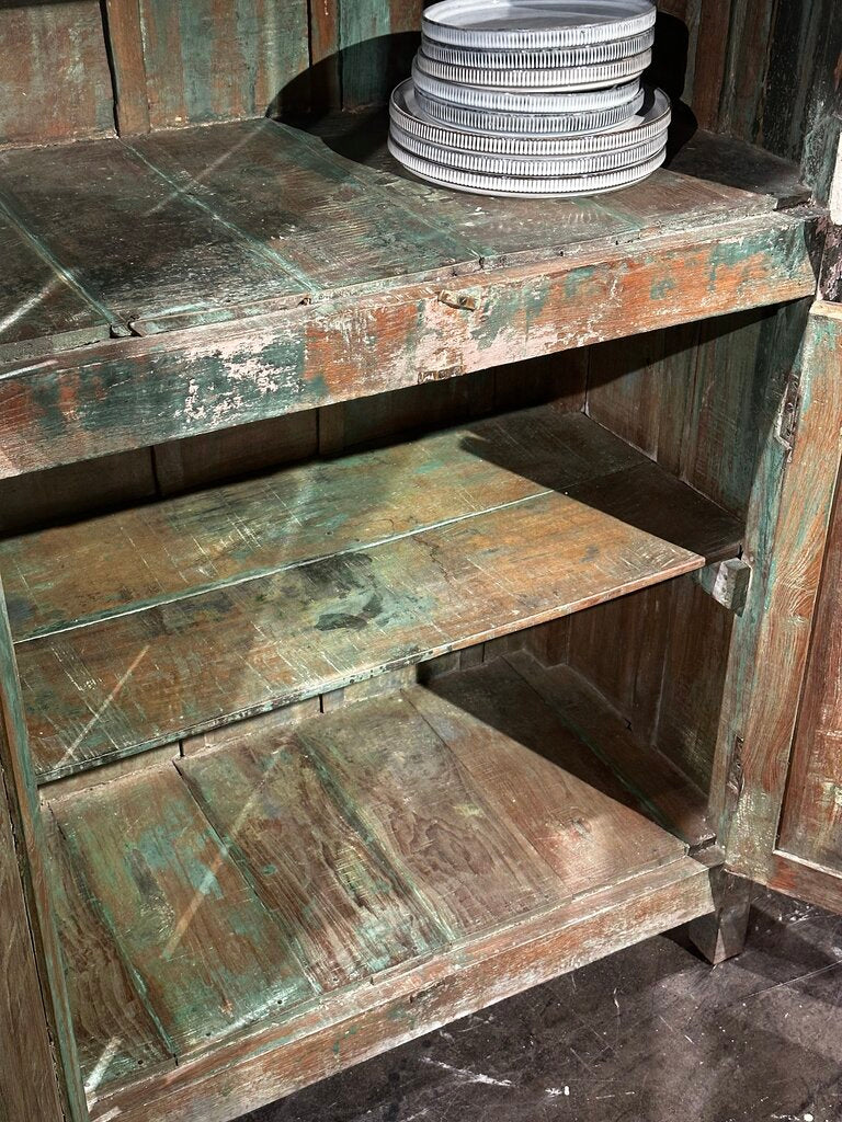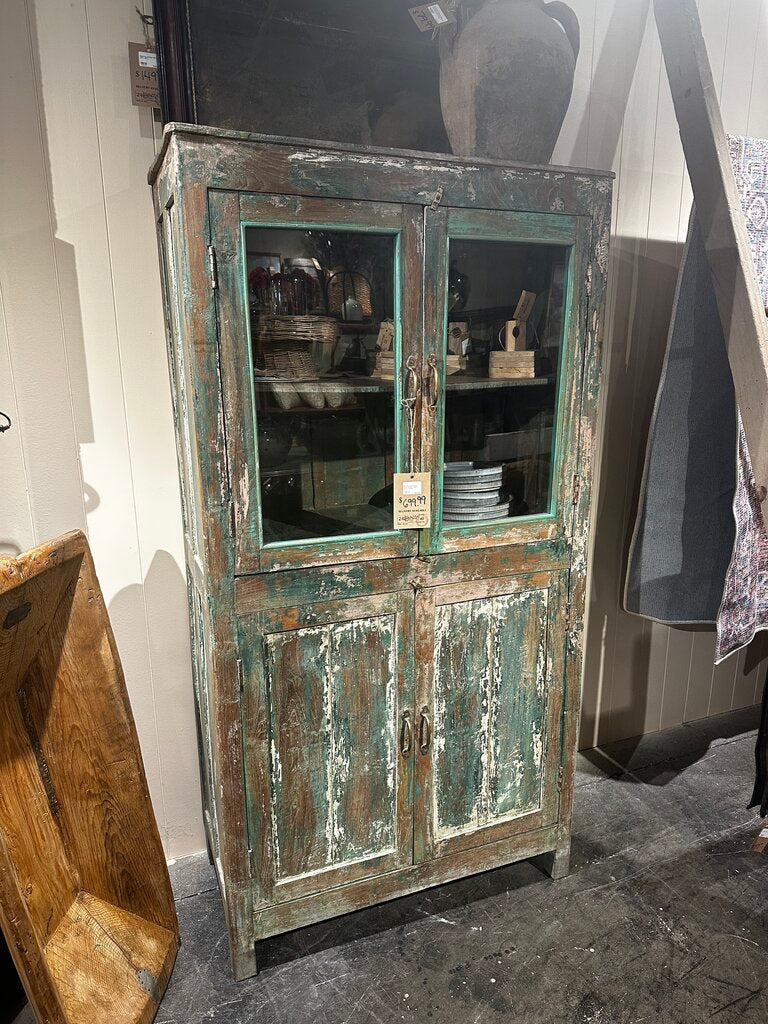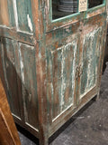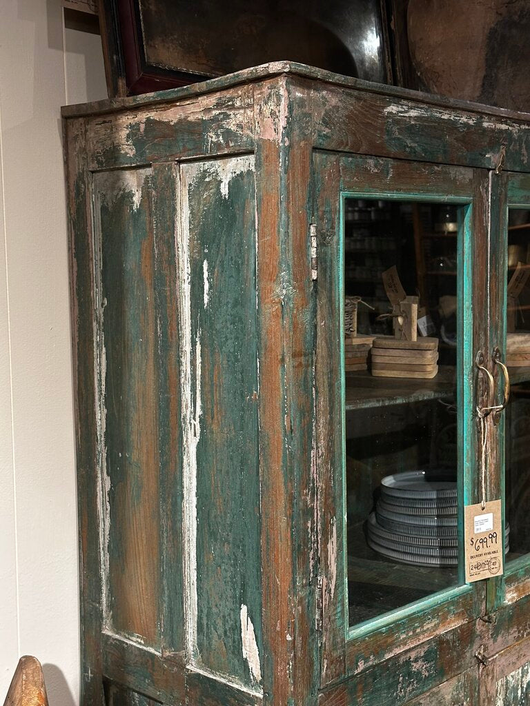A Beautiful Distressed Green Two Door Wood & Glass Cabinet