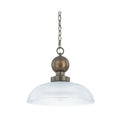 Easton Pendant - This pendant seamlessly blends classic craftsmanship with modern functionality, featuring a beautifully textured glass shade that diffuses light softly and creates a warm, inviting ambiance with subtle patterns. The intricate grid pattern on the glass is complemented by a rounded metal cap and sphere detail, nodding to traditional design elements. Finished in a rich, antique bronze with a subtle sheen, it adds warmth and refinement, making it versatile enough for modern industrial or classic transitional interiors.