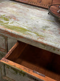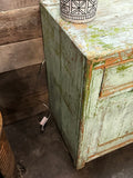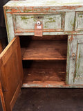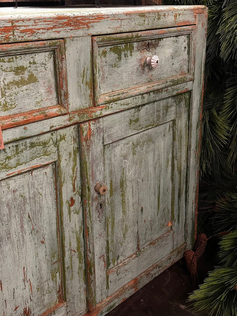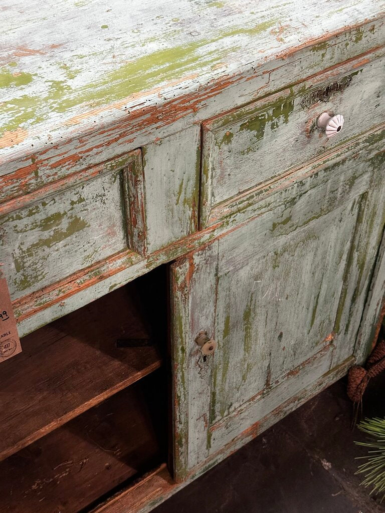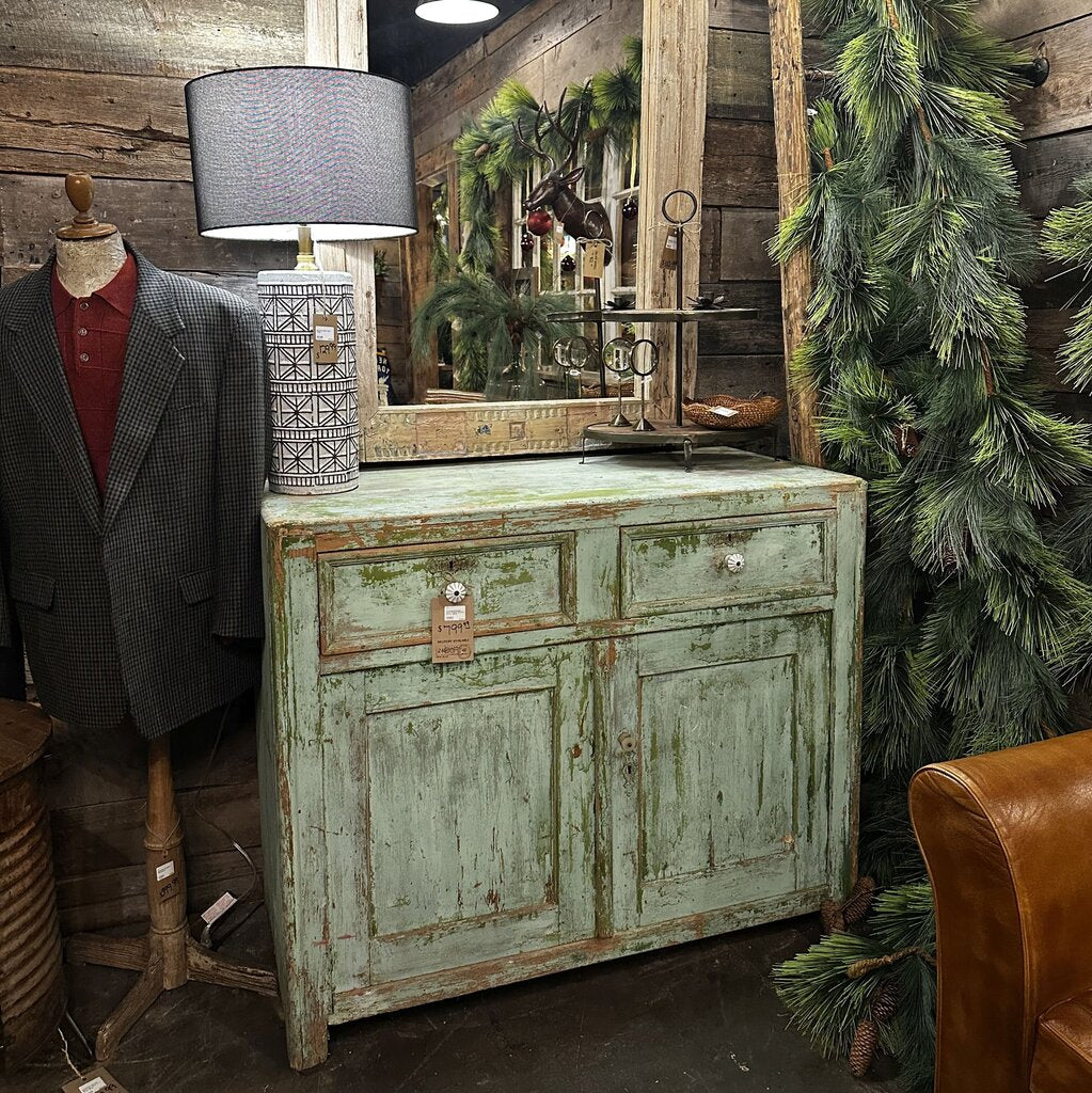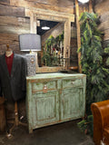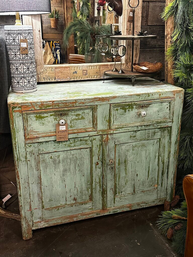 An Amazing Green European Green Cabinet featuring a chippy look. This cabinet has 2 drawers, 2 cabinet doors and a shelf inside.