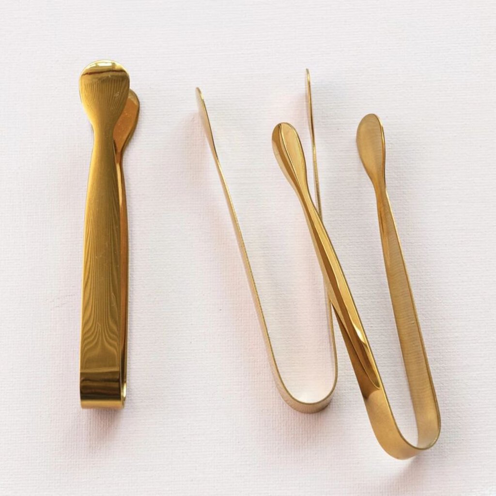 Sleek Gold Finish Stainless Steel Tongs. Perfect for a cocktail ice bucket or snack board!