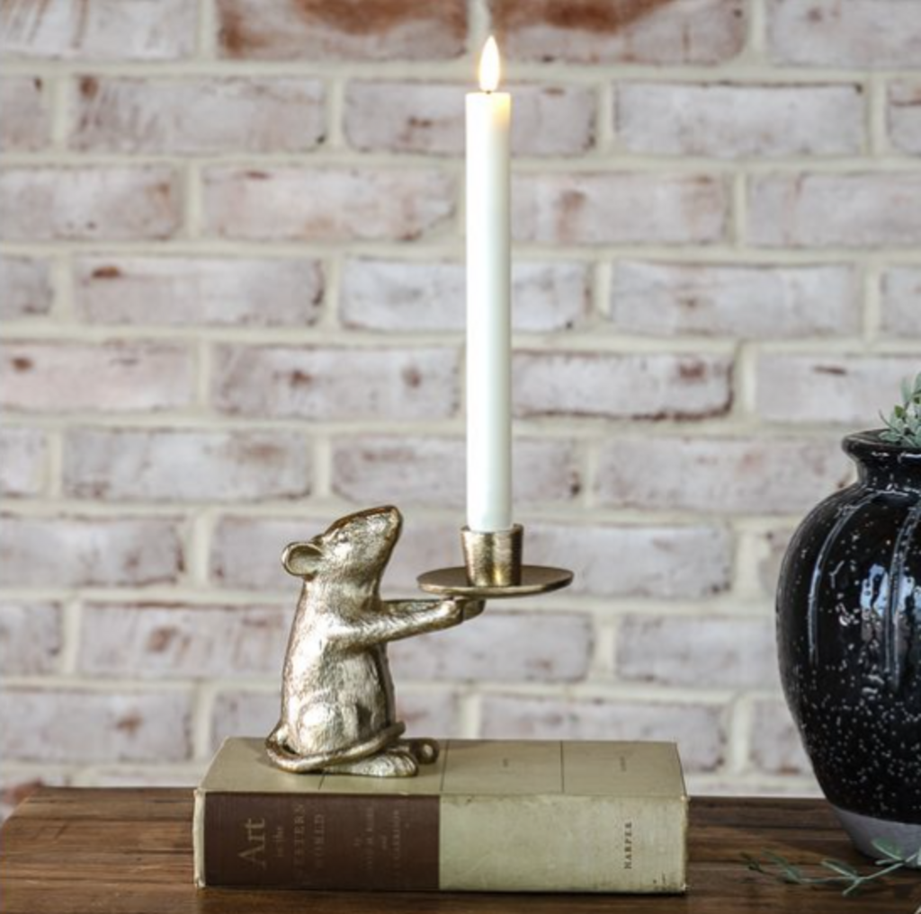An adorable mouse taper holder with a gold finish