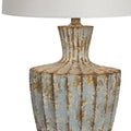 The Jada Table Lamp captures the charm of vintage pottery with its sculpted resin base. Its ribbed, fluted silhouette is reminiscent of antique vessels, enhanced by a distressed blue and gold finish that adds character. A natural linen drum shade softens the design, casting a warm and inviting glow.