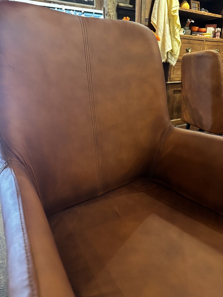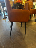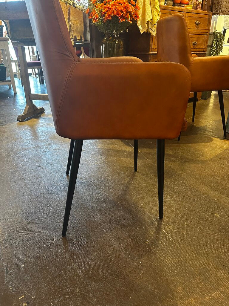 This camel color leather dining chair features beautiful stitching and black metal legs.