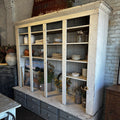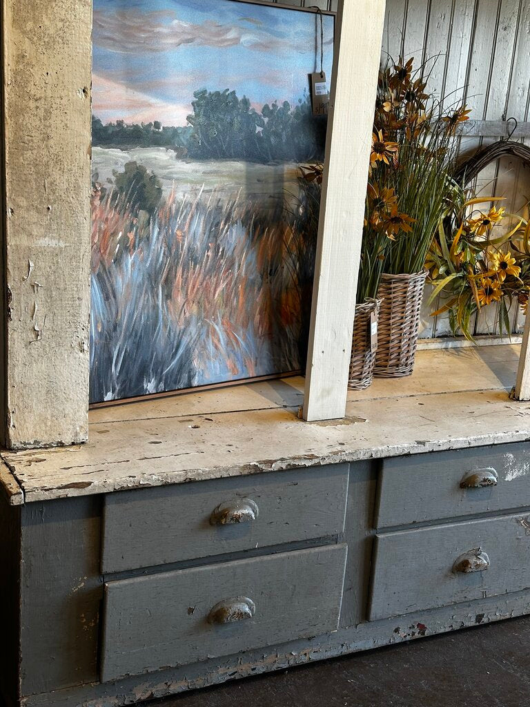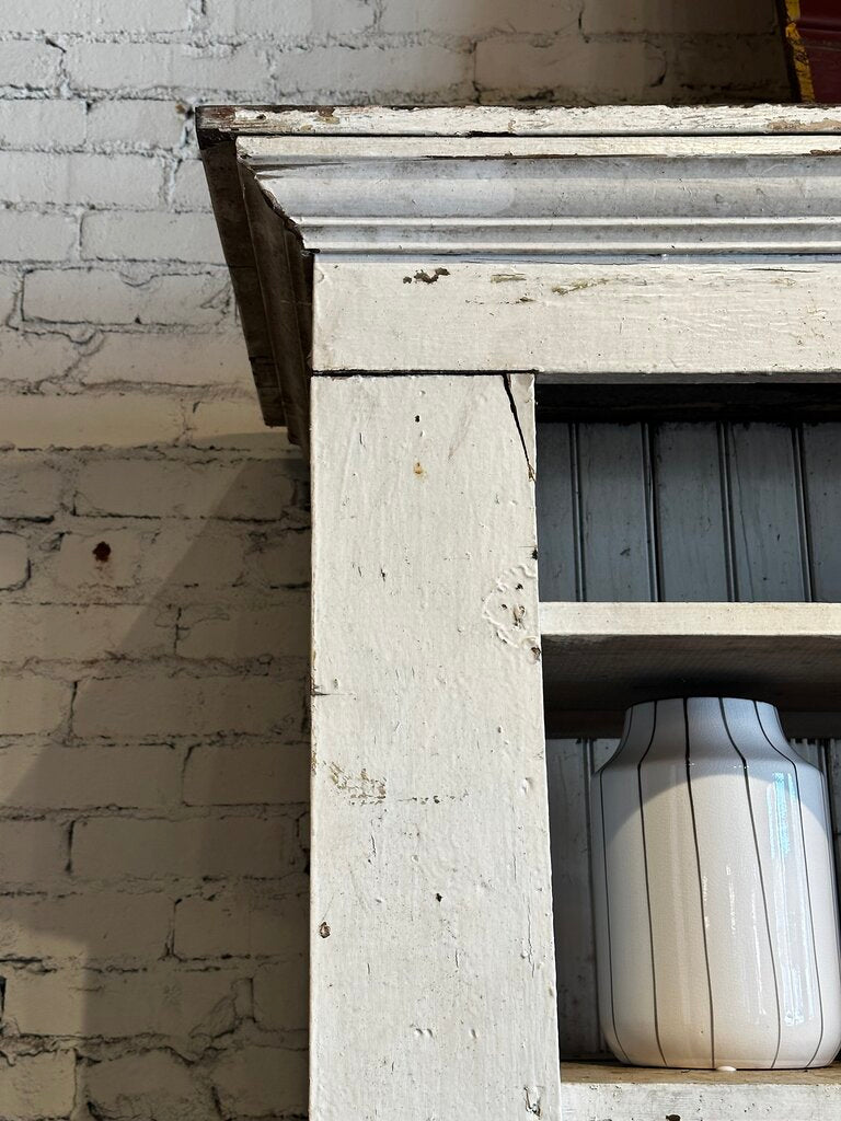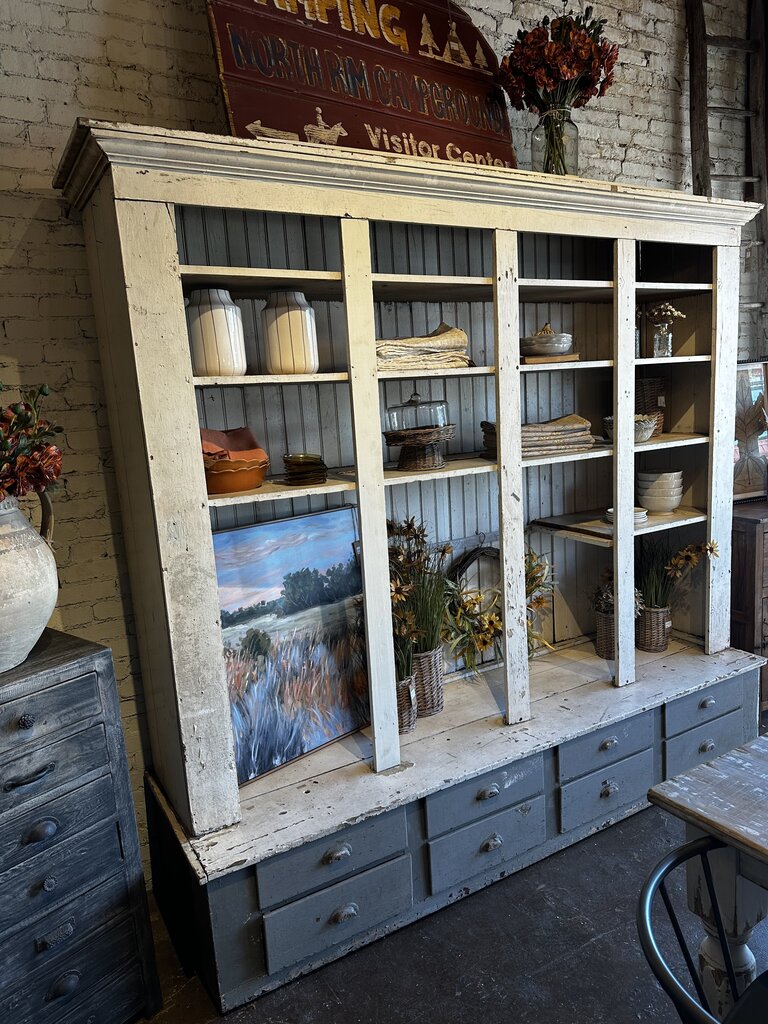 A Stunning Old World Shelf + Drawer Piece. This shelf features 8 functional drawers, and 3 large shelves. The top of the piece seperates from the bottom for easier transport. This piece is old, chippy, and has so much character!