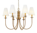 Juliet Chandelier - This large chandelier effortlessly blends texture with a sleek design. Rattan-wrapped arms extend from an antique gold frame to white linen shades on metal disks, radiating warmth and opulence